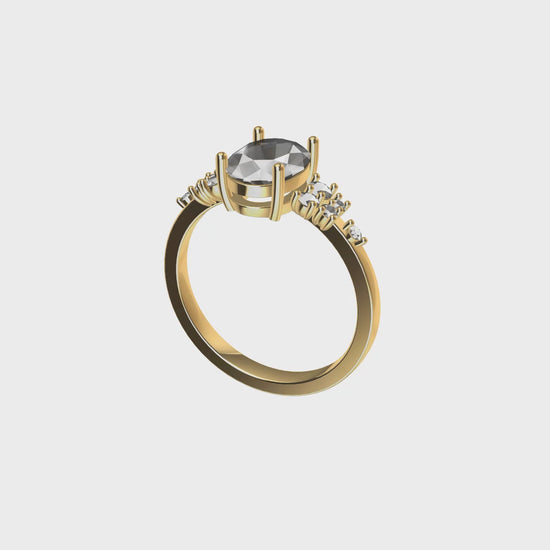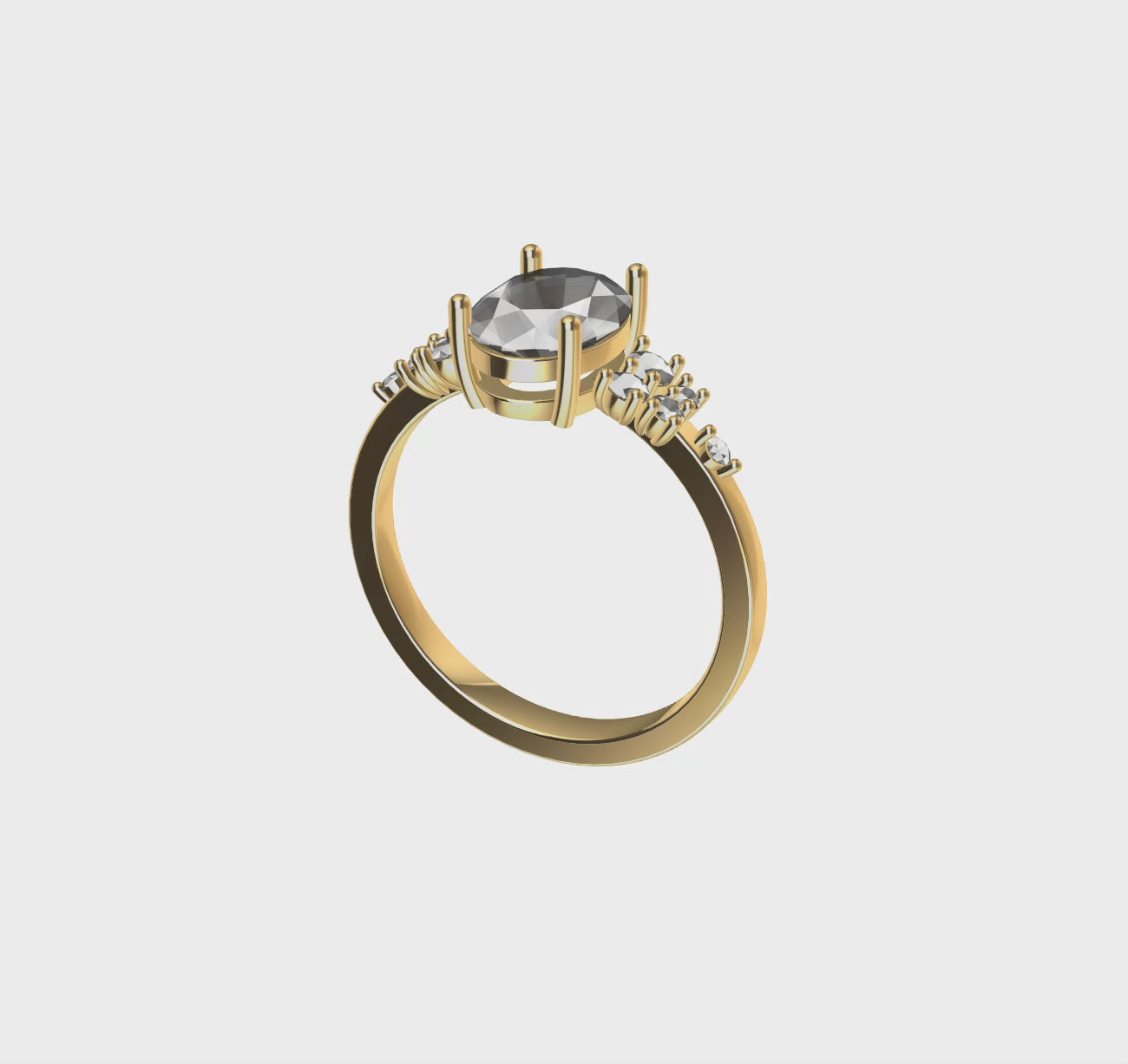 Sophisticated ring design featuring an oval-cut center gemstone secured with a four-prong setting that enhances its natural brilliance. The look is complemented by a graduated row of side stones that adds movement and depth to the piece. Ideal for those seeking classic elegance with a contemporary touch. Every detail has been carefully crafted to ensure durability and lasting beauty.
