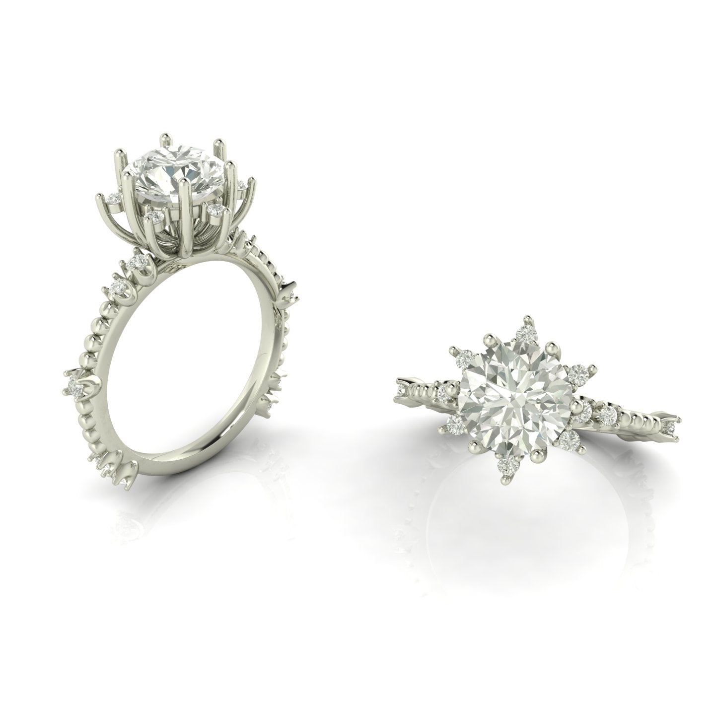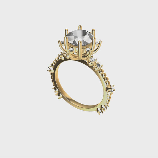 Engagement ring designed with a multi-prong setting that both protects and enhances a round-cut center gemstone. The side band features strategically placed inset stones, creating a luminous, continuous effect around the finger. This configuration offers exceptional stability and a balanced visual presence—perfect for those who value fine jewelry craftsmanship and want a ring that transcends trends.